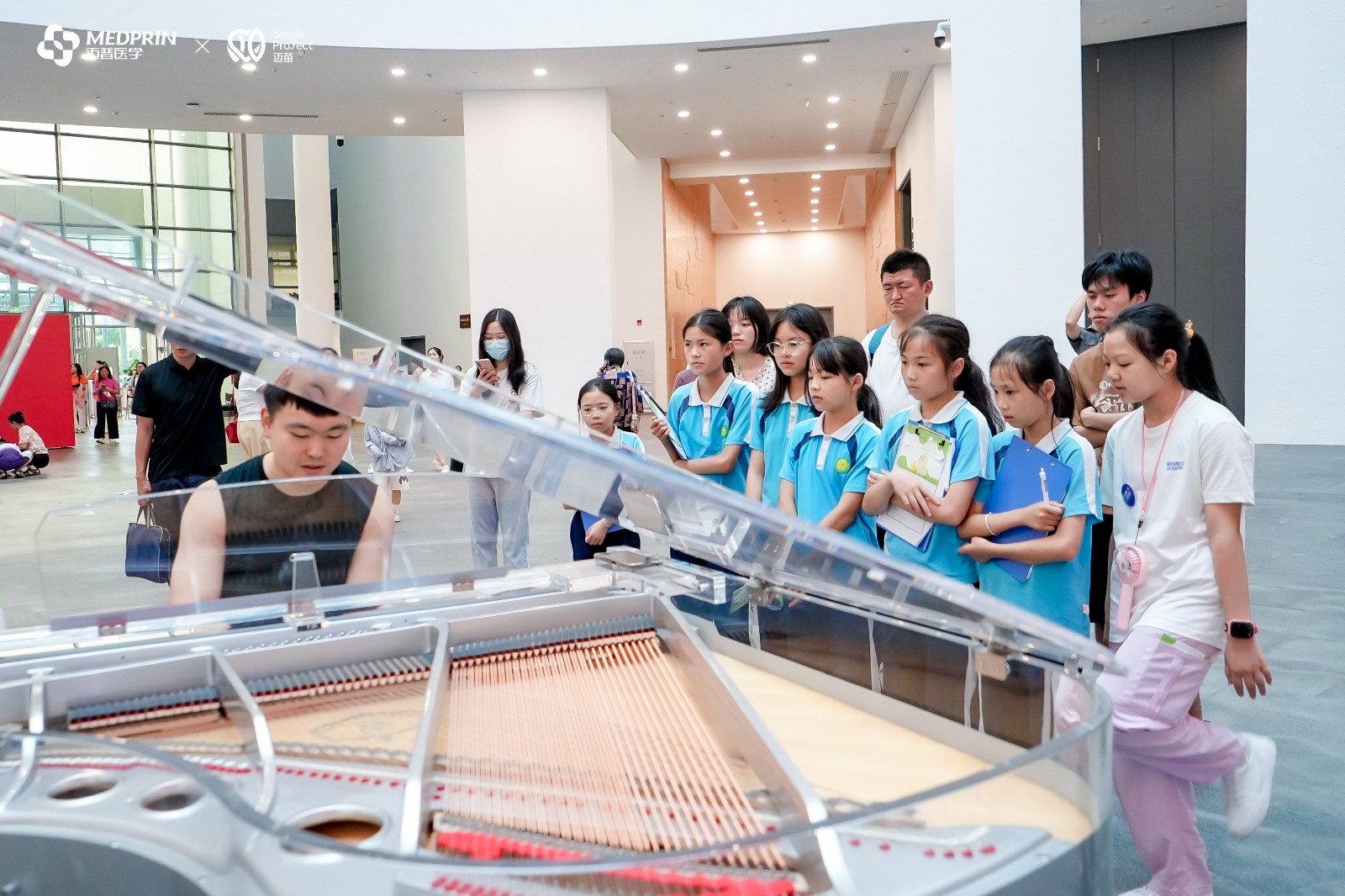 首日的研學活動從參訪邁普醫學公司總部展廳開始,師生們一同跟著講解員的節奏,在這里學習研究高性能醫療器械研發的全過程:研發工程師如何在實驗室里將技術轉化成樣品,再經過系列嚴格驗證后獲得產品注冊證書,穩定生產出醫療器械產品交到醫生手中使用,造?;颊?。